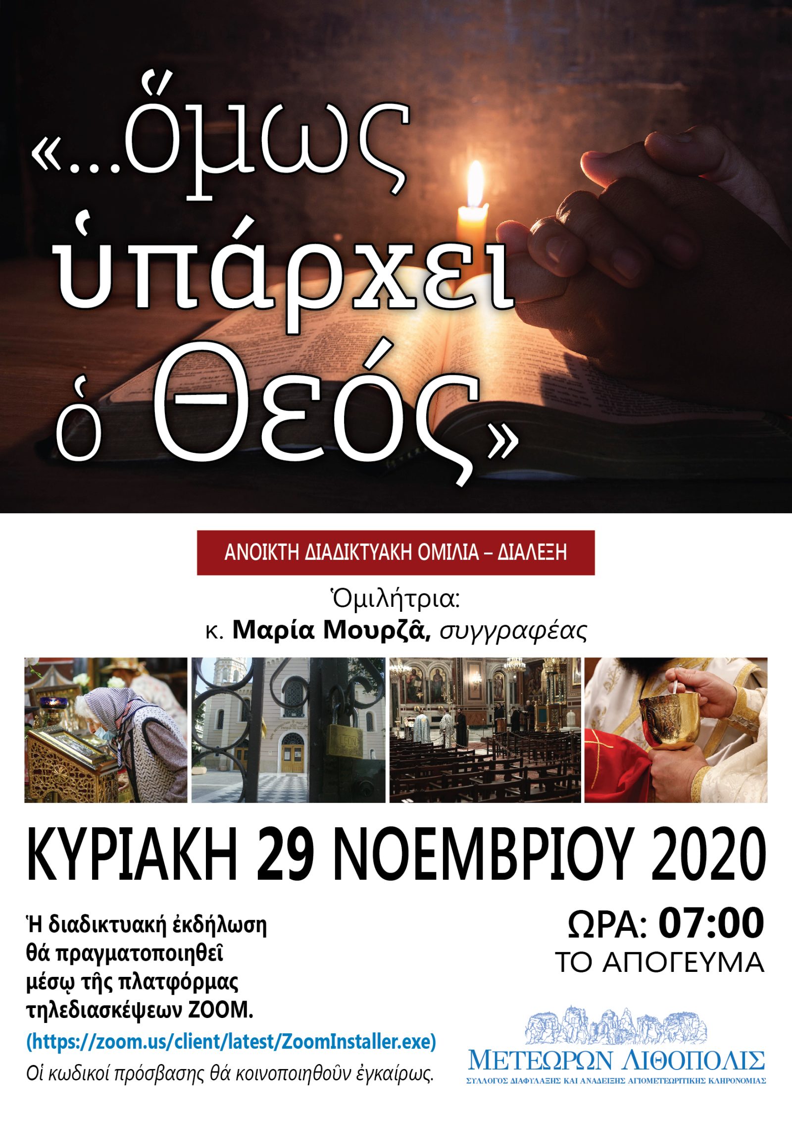 Στην εκδήλωση θα μιλήσει η γνωστή συγγραφέας κ. Μαρία Μουρζά, με θέμα: «… όμως υπάρχει ο Θεός».
