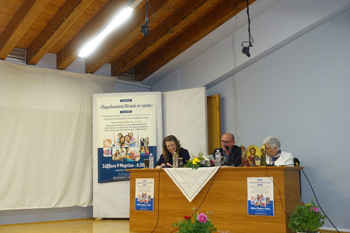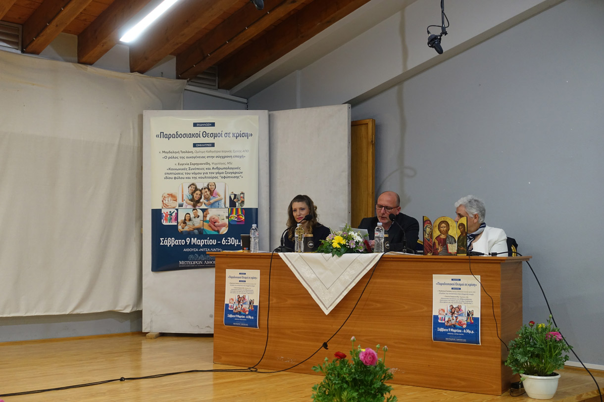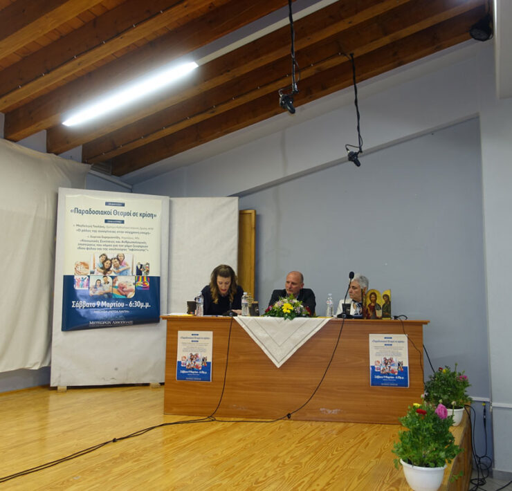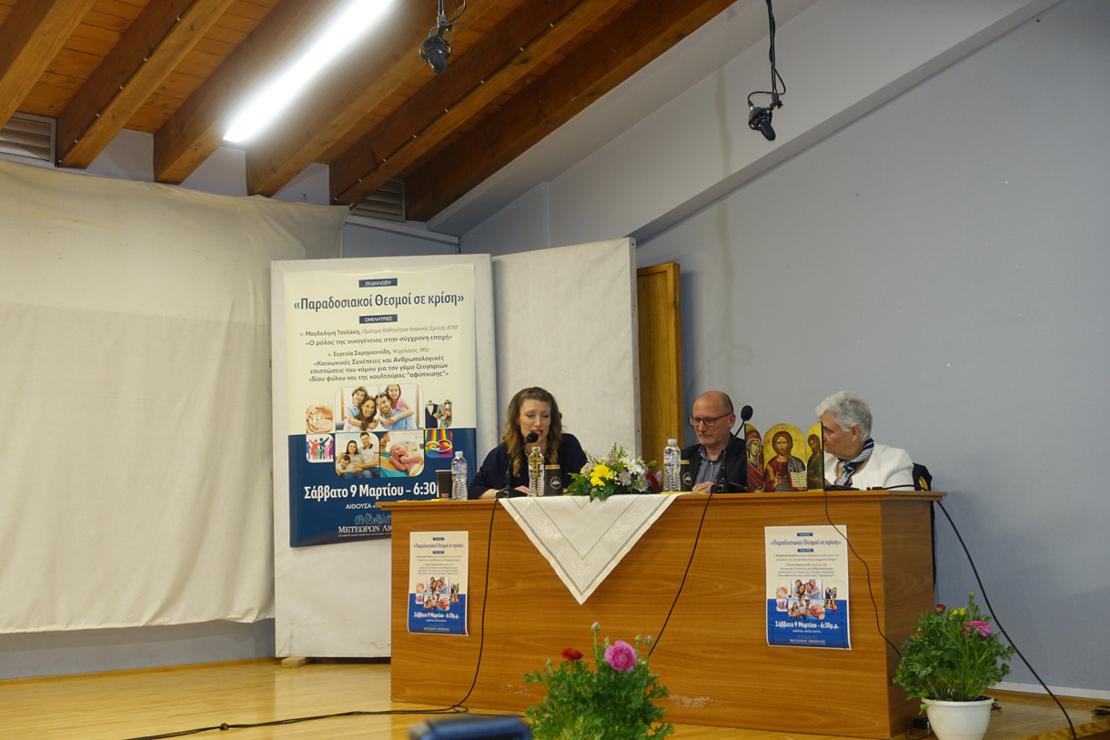 Ο Σύλλογός μας, στην προσπάθειά του να ενημερώσει και ευαισθητοποιήσει την τοπική κοινωνία επί του φλέγοντος αυτού θέματος, αποφάσισε να πραγματοποιήσει μια σειρά δράσεων με τον γενικό τίτλο “Παραδοσιακοί θεσμοί σε κρίση”. Σ’ αυτή τη σειρά εντάσσεται και η σημερινή μας εκδήλωση. Οι δύο προσκεκλημένες ομιλήτριες, διακεκριμένες επιστήμονες στον τομέα τους η κάθε μία, θα μας παρουσιάσουν το πρόβλημα των σύγχρονων απειλών για την ελληνική οικογένεια και γενικότερα για την ελληνική κοινωνία.