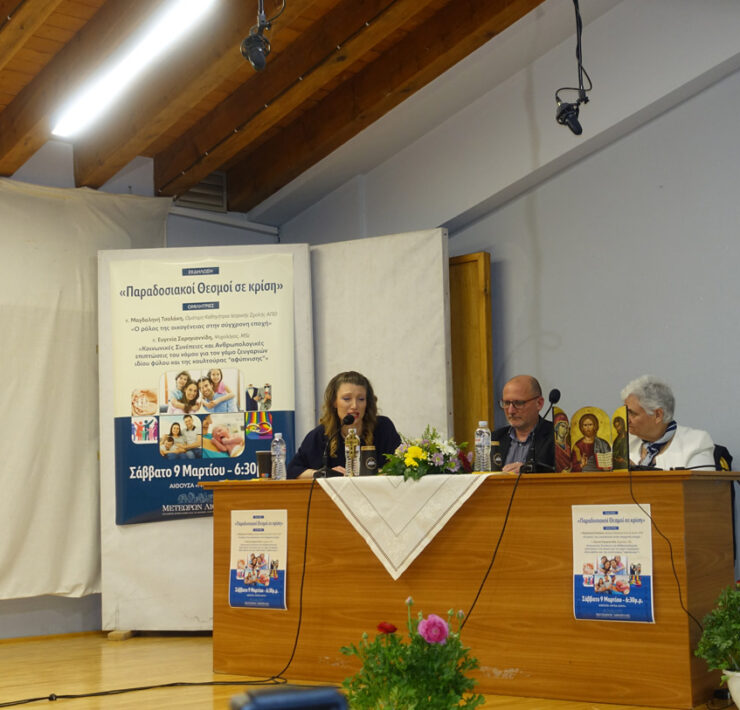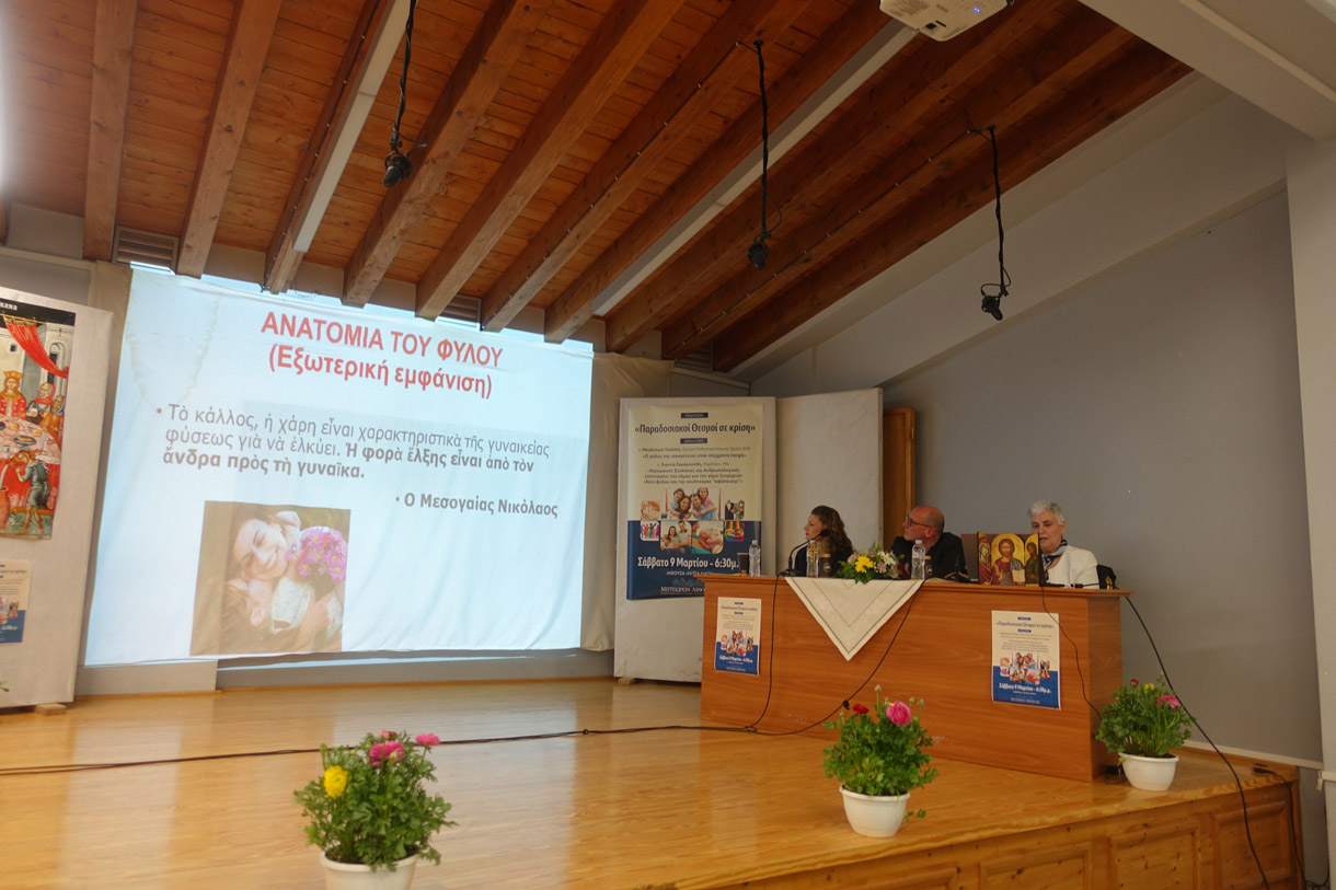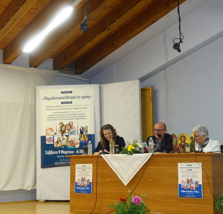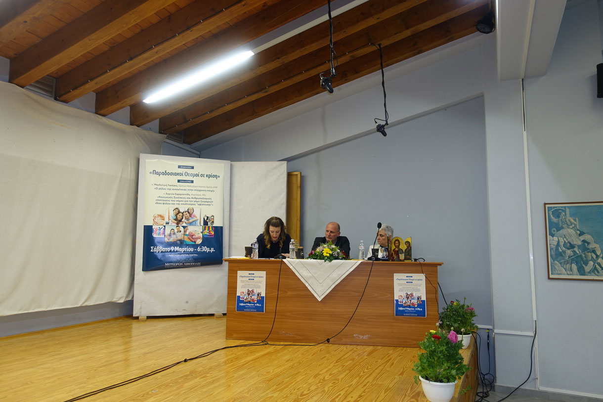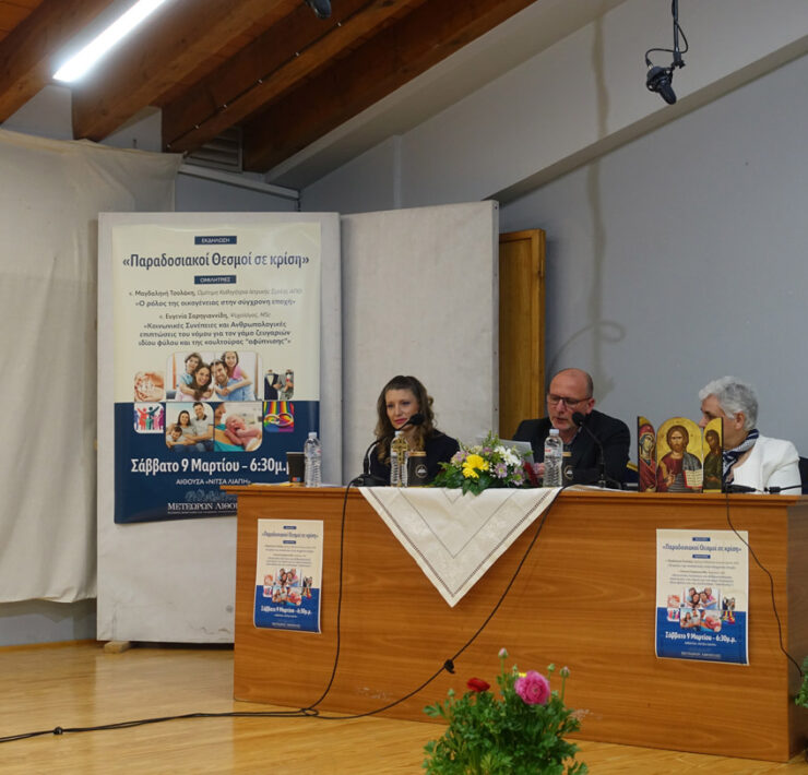 Ο Σύλλογός μας, στην προσπάθειά του να ενημερώσει και ευαισθητοποιήσει την τοπική κοινωνία επί του φλέγοντος αυτού θέματος, αποφάσισε να πραγματοποιήσει μια σειρά δράσεων με τον γενικό τίτλο “Παραδοσιακοί θεσμοί σε κρίση”. Σ’ αυτή τη σειρά εντάσσεται και η σημερινή μας εκδήλωση. Οι δύο προσκεκλημένες ομιλήτριες, διακεκριμένες επιστήμονες στον τομέα τους η κάθε μία, θα μας παρουσιάσουν το πρόβλημα των σύγχρονων απειλών για την ελληνική οικογένεια και γενικότερα για την ελληνική κοινωνία.