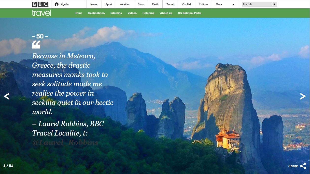 Τα Μετέωρα είναι ένας από τους 50 λόγους για να αγαπήσει κανείς τον κόσμο! Αυτό υποστηρίζει μεταξύ άλλων το BBC Travel Localite και η συντάκτρια του, Laurel Robbins, σε κείμενο που υλοποίησε για τους 50 λόγους που πρέπει να ξέρουμε για να αγαπήσουμε τον κόσμο μας…