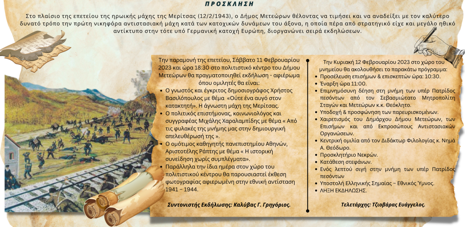 Το πρόγραμμα εκδηλώσεων του Δήμου Μετεώρων στο πλαίσιο της Επετείου της Μάχης της Μερίτσας 6 Φεβρουαρίου 2023 0 Shares 0 0 0 Comments 0 0